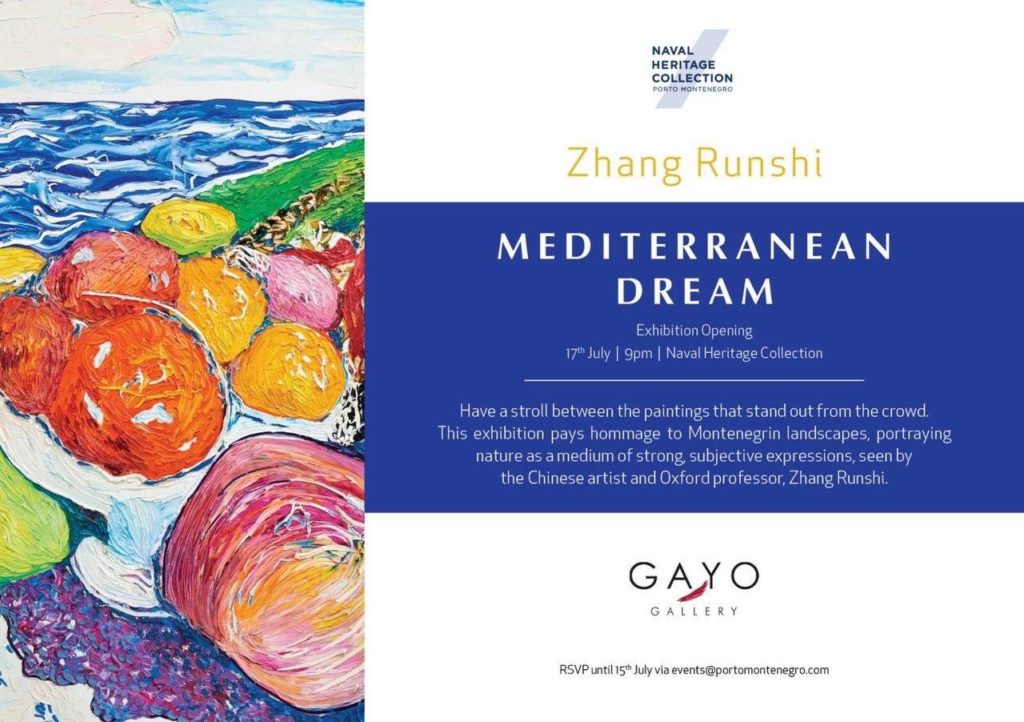 Za kraj ove sedmice, ali ne i ljeta, pripremljena je izložba slika kineskog umjetnika Zhang Runshija pod nazivom Mediterranean dream. Izložba će biti otvorena u subotu 17. jula u 21h u Zbirci pomorskog nasljedja u Porto Montenegru. Umjetnik je kolekciju ovih slika napravio za vrijeme boravka u Crnoj Gori, inspirisan crnogorskim pejzažima. Publika će moći da uživa u njegovim djelima do 15. avgusta.